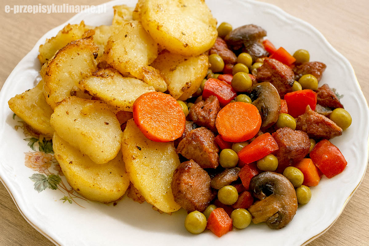 Szukasz pomysłu na szybki i sycący obiad z prostych składników? Ta potrawka z kiełbasy z dodatkiem warzyw i pieczonych ziemniaków to strzał w dziesiątkę. Przygotujesz ją bez większego wysiłku, a efekt będzie naprawdę pyszny – aromatyczna, lekko pikantna kiełbasa połączona z chrupiącymi ziemniaczkami sprawdzi się zarówno na codzienny posiłek, jak i na ciepłą kolację dla całej rodziny. To danie, które nie wymaga wielu składników, a mimo to zaskakuje smakiem i szybko znika z talerzy.