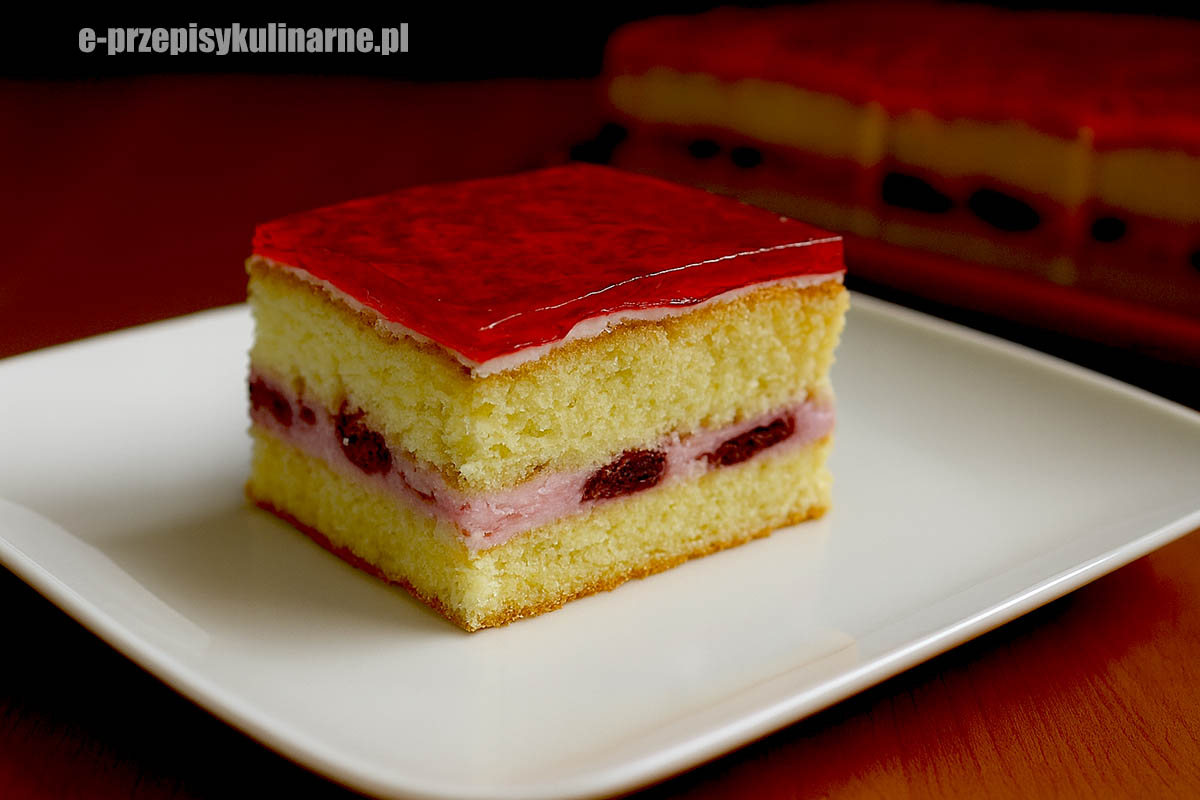 Najlepiej smakuje dobrze schłodzony, wtedy bita śmietana i galaretka mają idealną strukturę. Pokrój go w równe kostki lub prostokątne kawałki i podaj z kawą, herbatą albo kieliszkiem zimnego kompotu. To doskonały deser na spotkania z rodziną czy przyjaciółmi.