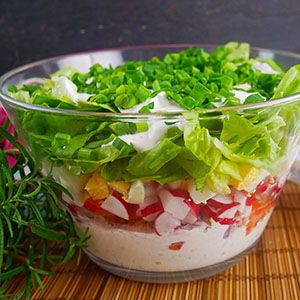 Wiosenna sałatka warstwowa z serkiem wiejskim – szybka i smaczna