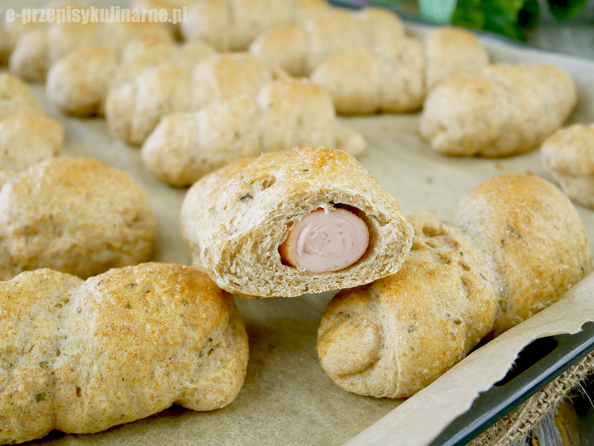 Bo są naprawdę proste, miękkie i smaczne — a do tego wyglądają efektownie, mimo że ich przygotowanie zajmuje chwilę. Ciasto jest miękkie dzięki połączeniu mąki pełnoziarnistej z pszenną typ 500 i dodatkiem maślanki, a każdy rulon ciasta owinięty wokół parówki nadaje im domowy charakter. To świetny sposób na wykorzystanie zwykłych składników i przygotowanie czegoś, co smakuje zarówno dzieciom, jak i dorosłym. Bułki dobrze znoszą przechowywanie, można je zabrać w drogę, a po odgrzaniu w piekarniku następnego dnia znowu są miękkie i pachnące.
