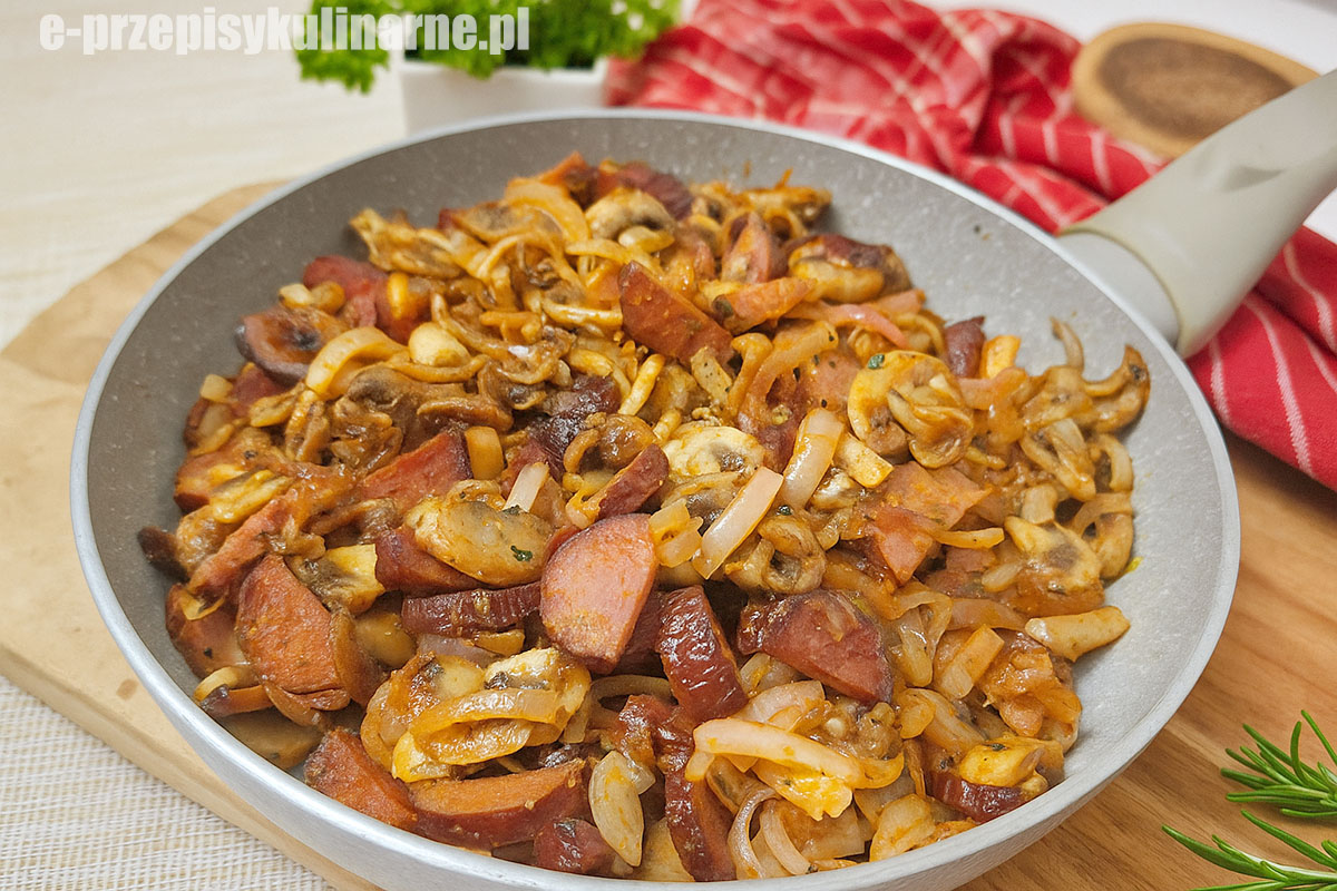 Swojska patelnia z kiełbasą i pieczarkami – prosty przepis na szybki i pyszny obiad