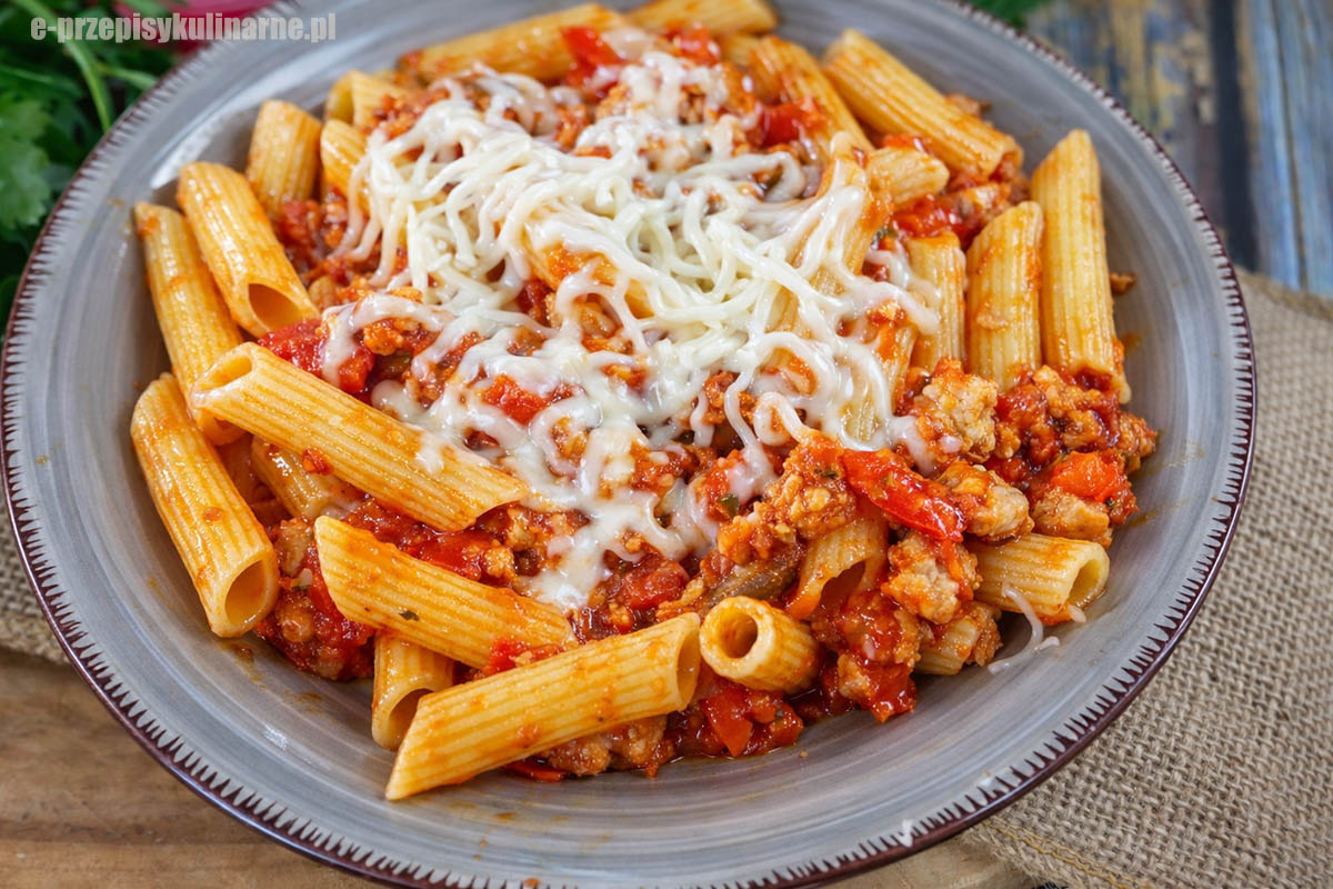 Makaron w sosie pomidorowym z mięsem i grzybami