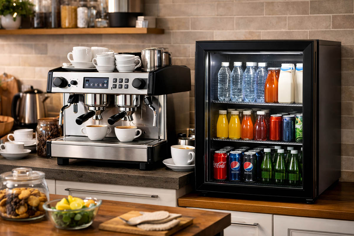 Podczas rodzinnych spotkań, świąt czy weekendowych wizyt znajomych najwięcej zamieszania robią… napoje i kawa. Ktoś szuka szklanek, ktoś otwiera lodówkę po sok, w międzyczasie ekspres parzy jedną filiżankę naraz, a mleko do cappuccino stoi gdzieś z tyłu między garnkami. Na blacie robi się tłok, w lodówce brakuje miejsca, a każda kolejna kawa oznacza kilka minut czekania. Zamiast spokojnie podać deser i usiąść z gośćmi przy stole, krążysz między blatem, lodówką i zlewem, kompletując wszystko po kolei.