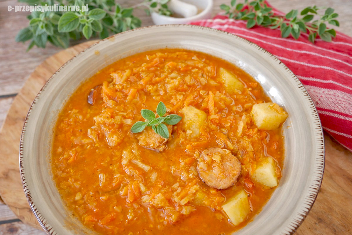 To bardzo sycąca zupa, która spokojnie może zastąpić cały obiad. Dzięki połączeniu kiełbasy, ziemniaków i soczewicy jest naprawdę treściwa.